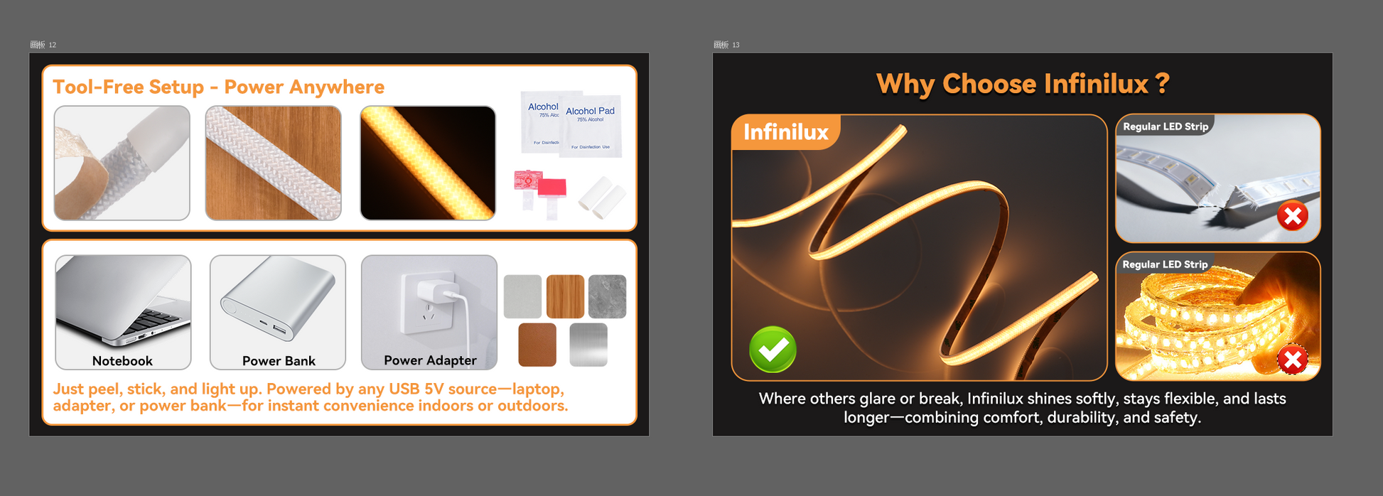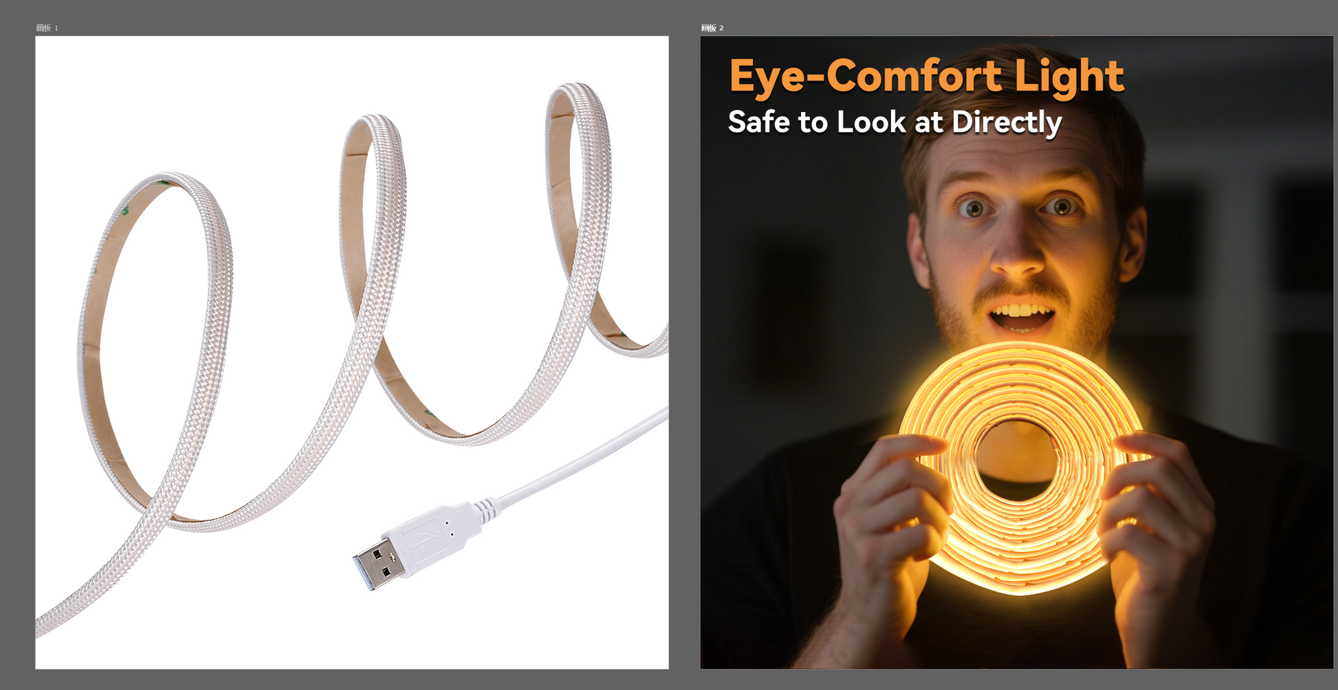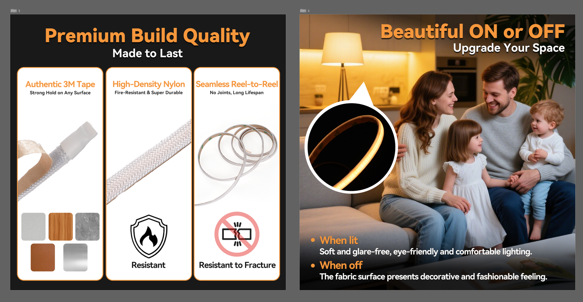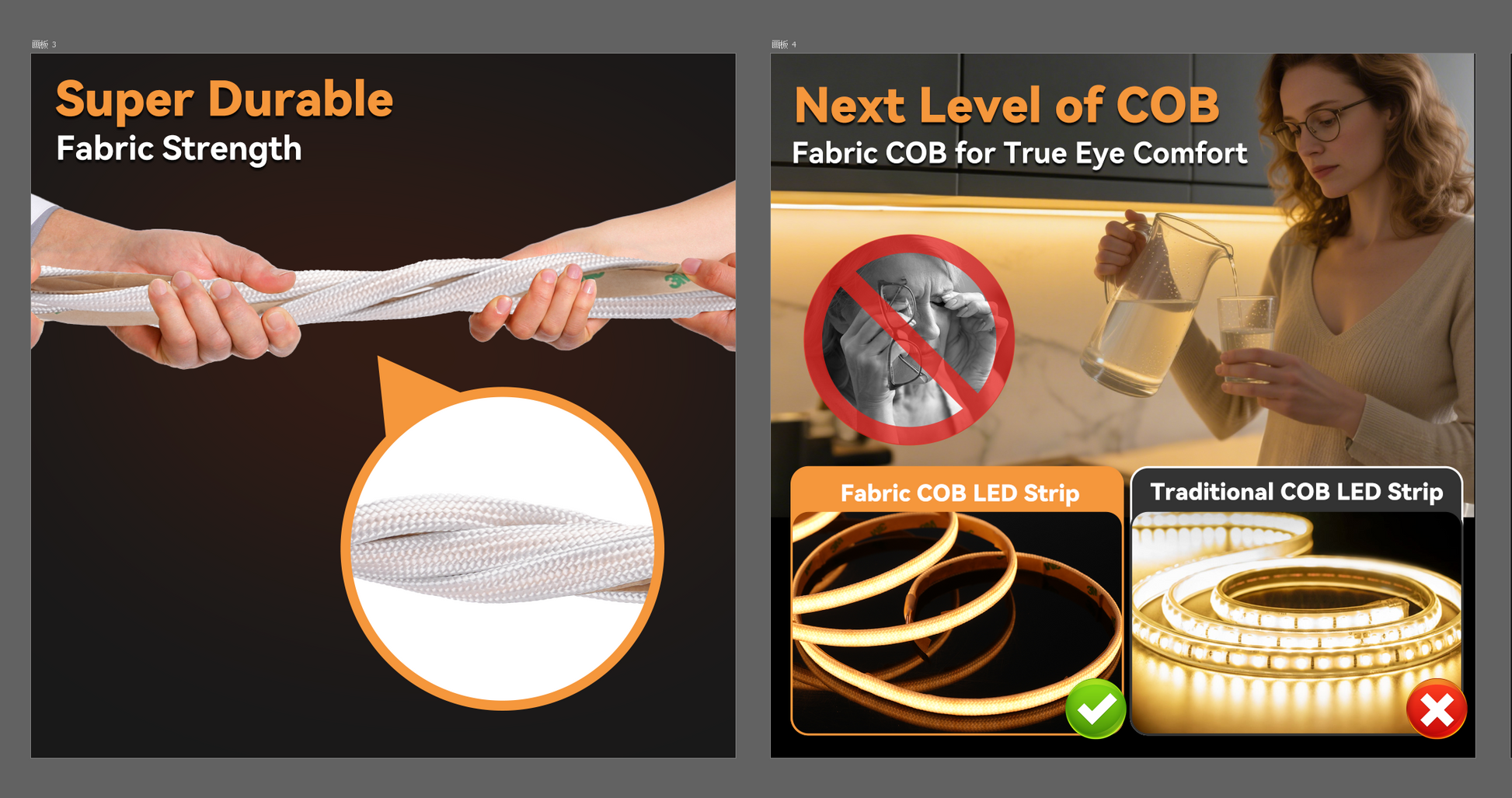 INFINILUX Fabric COB LED Strip Lights deliver smooth, continuous illumination with advanced COB technology—no dark spots and gentle on the eyes. Unlike standard silicone strips, our woven fabric mesh design adds durability, wear resistance and a stylish look.