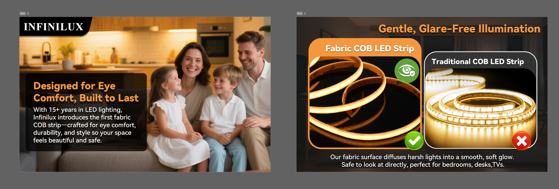 At Infinilux, light is more than just illumination—it's design, comfort and inspiration. With over 15 years of expertise in LED strip lighting, we've created fabric COB LED strips that deliver smooth, eye-comfortable brightness with a unique fabric mesh weave. Our mission is to think different and bring you lights that last longer, look better and make everyday spaces more enjoyable.